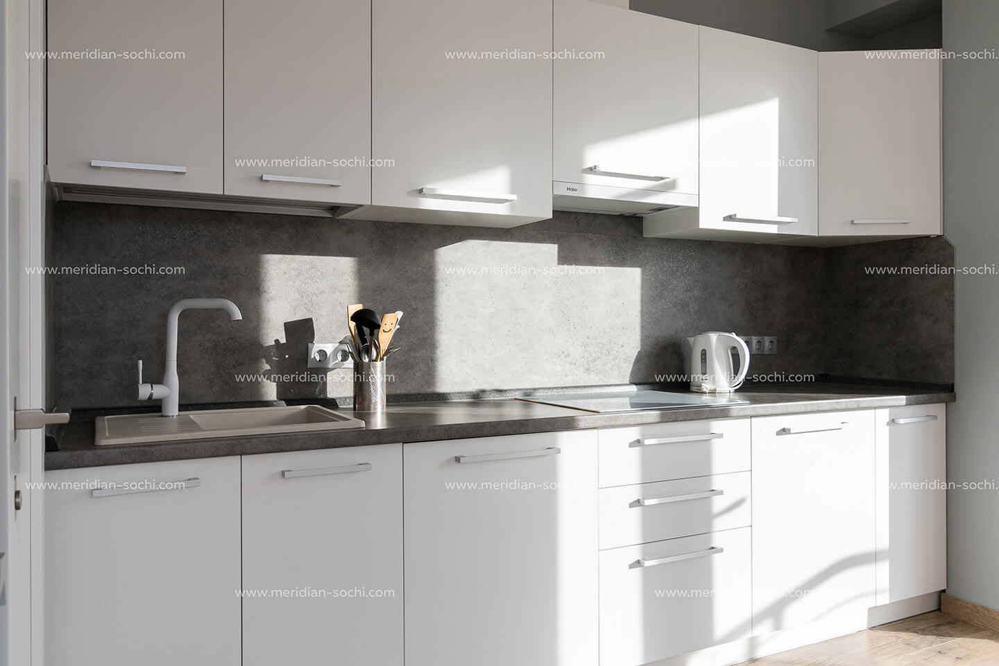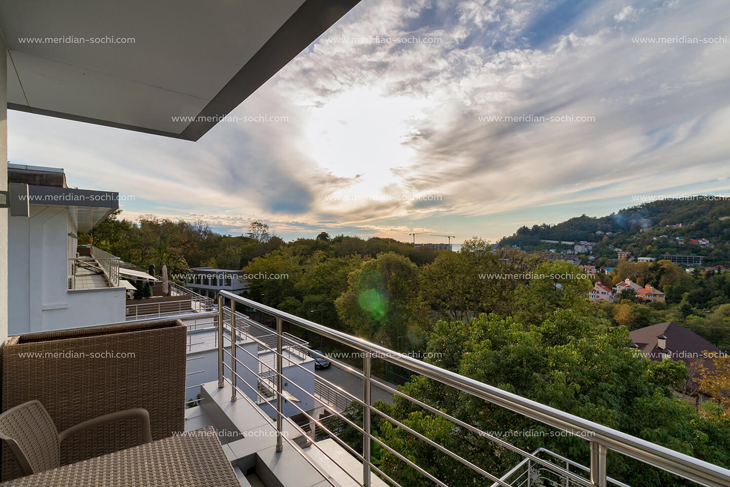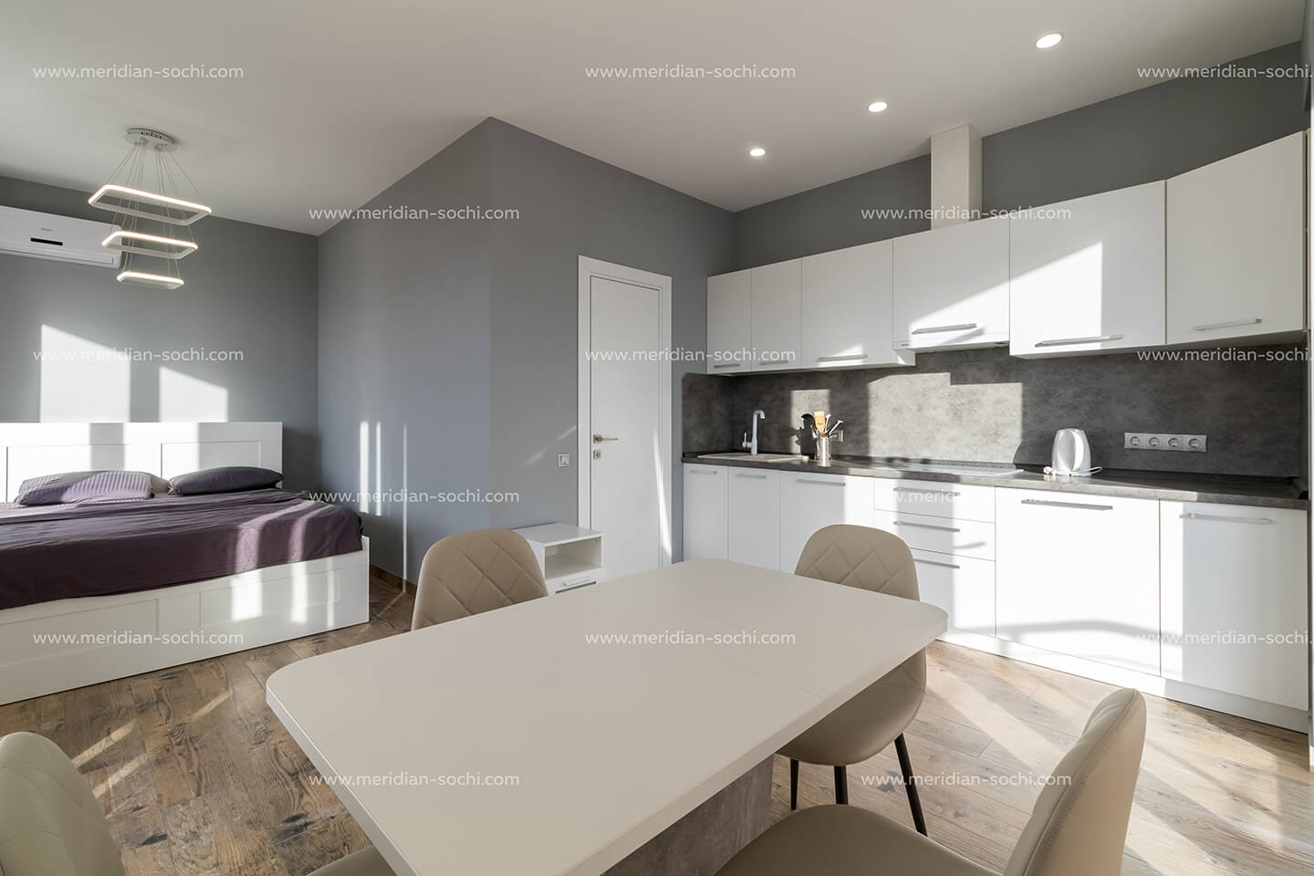 Просторная светлая студия видом на море и горы, оборудованная всем, что нужно для комфортного проживания и отдыха. В данном апартаменте имеется собственная терраса. Студия – мечта большинства молодых людей. Современный дизайн привлекает своим простором и оригинальностью.